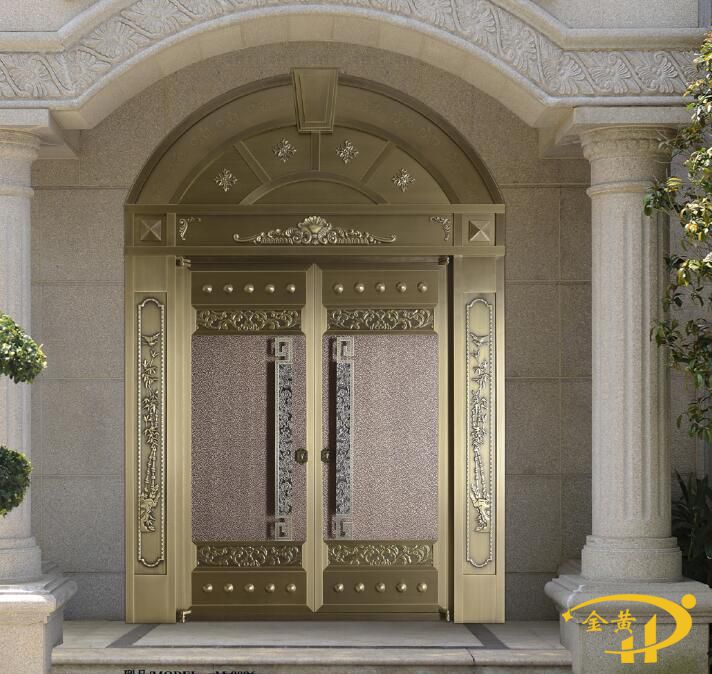 本款豪華別墅純銅門,型號是M-9077,門面采用整板模壓工藝,原材料為洛陽純紫銅或黃銅制作而成。 注意:羅馬柱、門頭高度、墻體厚和門柱寬度可根據客戶實際要求量身定制。
