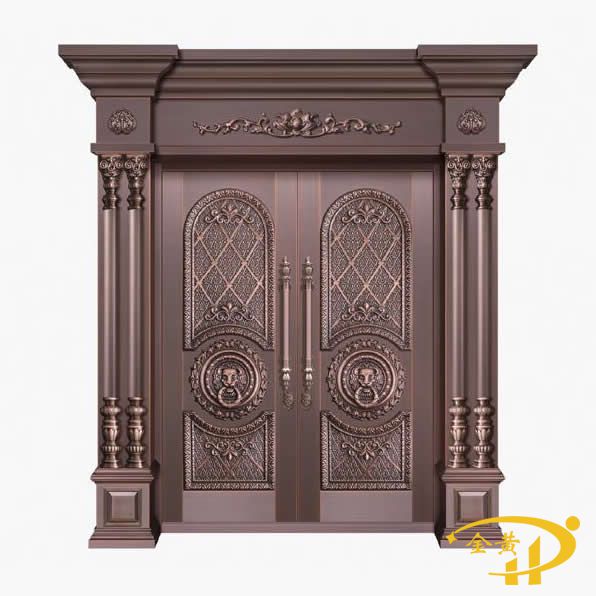 本款豪華別墅雙開門,型號(hào)是M-9075,門面采用整板模壓工藝,原材料為洛陽純紫銅或黃銅制作而成。