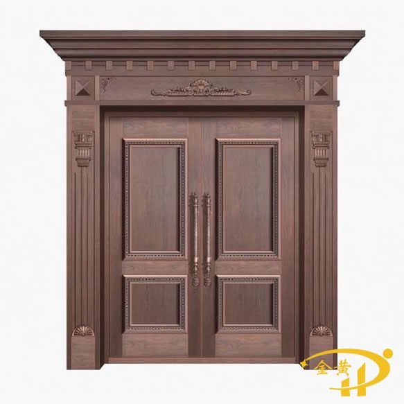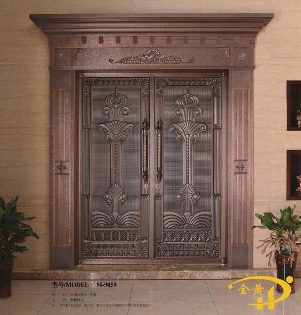 本款豪華雙開別墅門,型號是M-9029,門面采用精雕木紋工藝,原材料為洛陽純紫銅或黃銅制作而成。 注意:羅馬柱、門頭高度、墻體厚和門柱寬度可根據客戶實際要求量身定制。